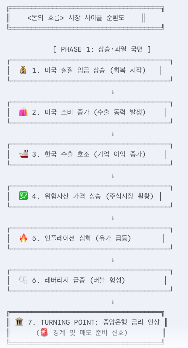 | 회복기 (Recovery) | 미국 실질 임금 상승 시작 미국 소비 심리 회복 한국 수출 실적 개선 자산 가격 바닥 다지기 및 반등 |